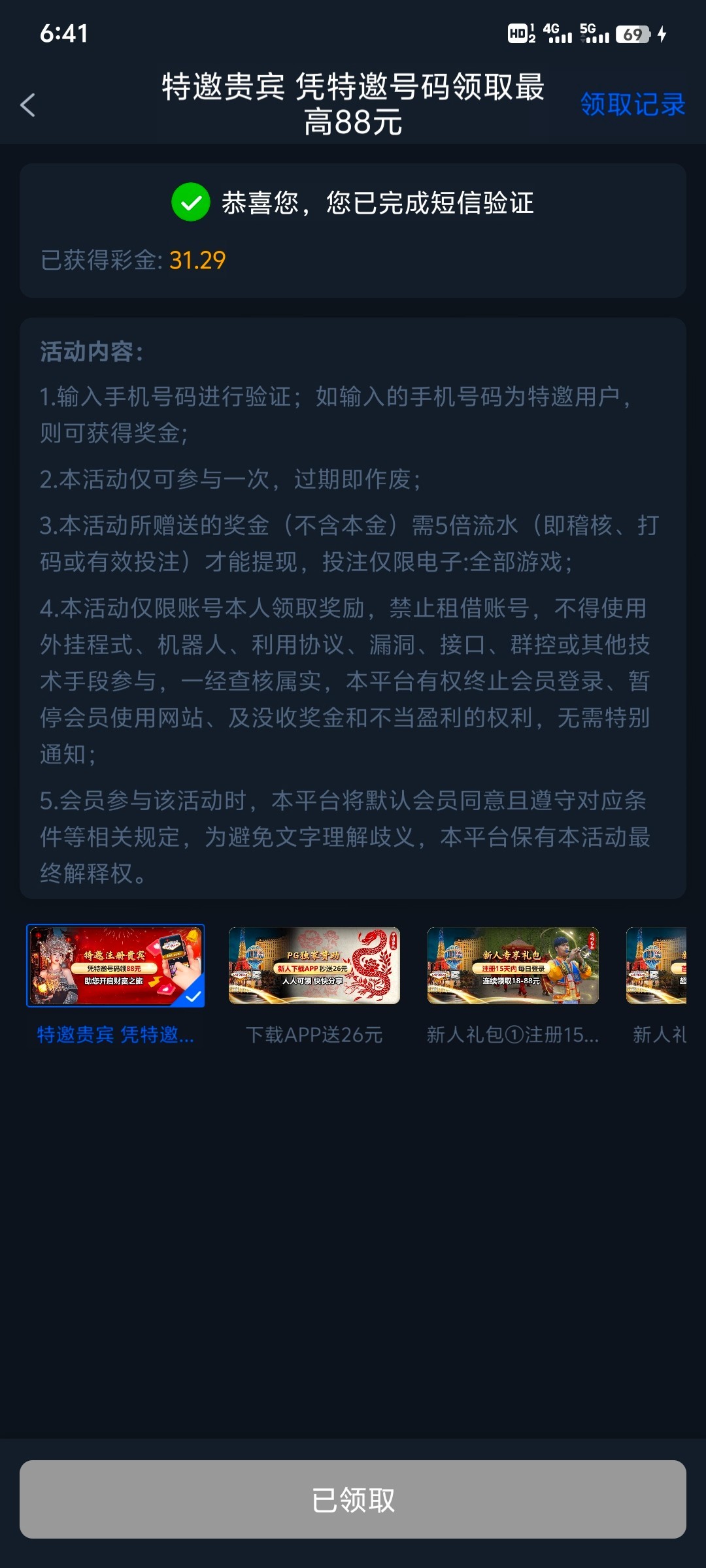 碰这个破玩意儿有个屁用,前两天给我打四五个电话。领了18块钱彩金,打到100块钱,账户直接冻结了。没格局 100块钱有什么可黑的