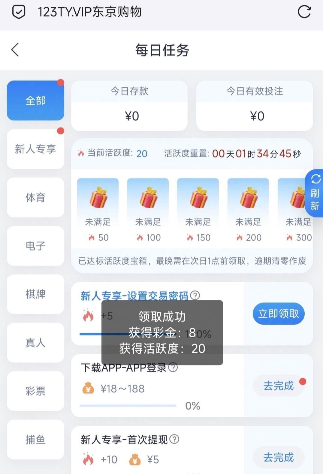 新用户注册完善资料,每日任务里秒领8