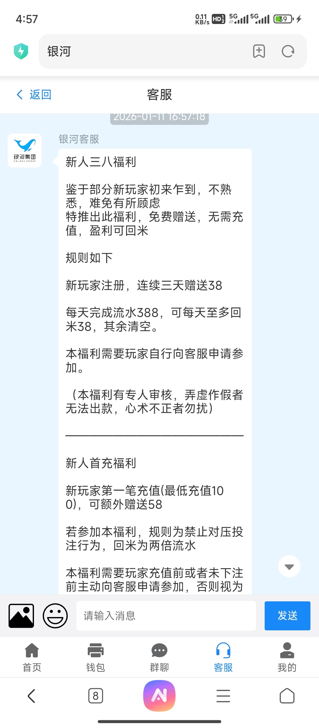 注册绑定好提现方式联系客服发送新人注册38彩金,不查ip手机号多的可以一直嫖,连续领3天,388流水下38,有人亲测到账,我没打出来,禁止充值,白嫖即可