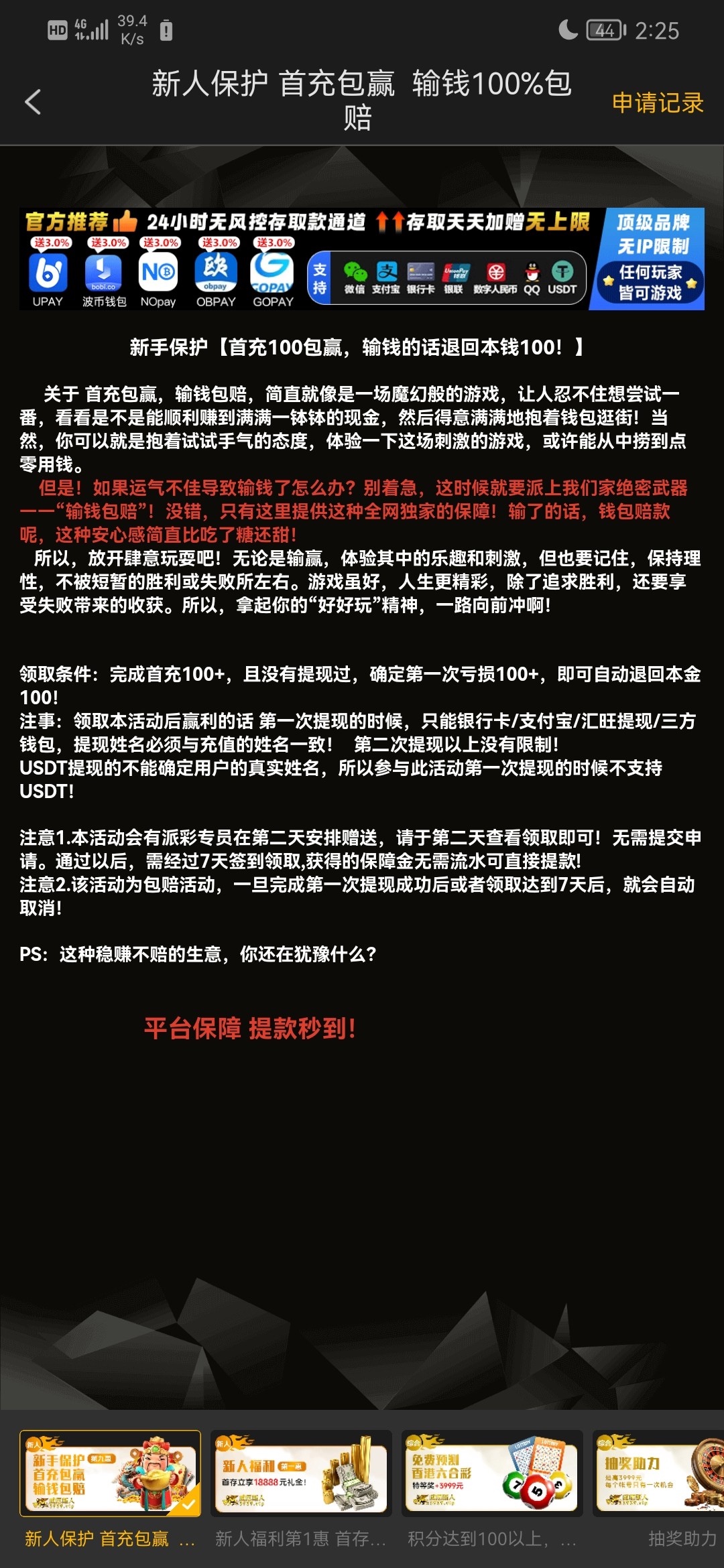 老用户签到不用充值 还有100包赔领包赔要签到7天 我签到第一天12块钱