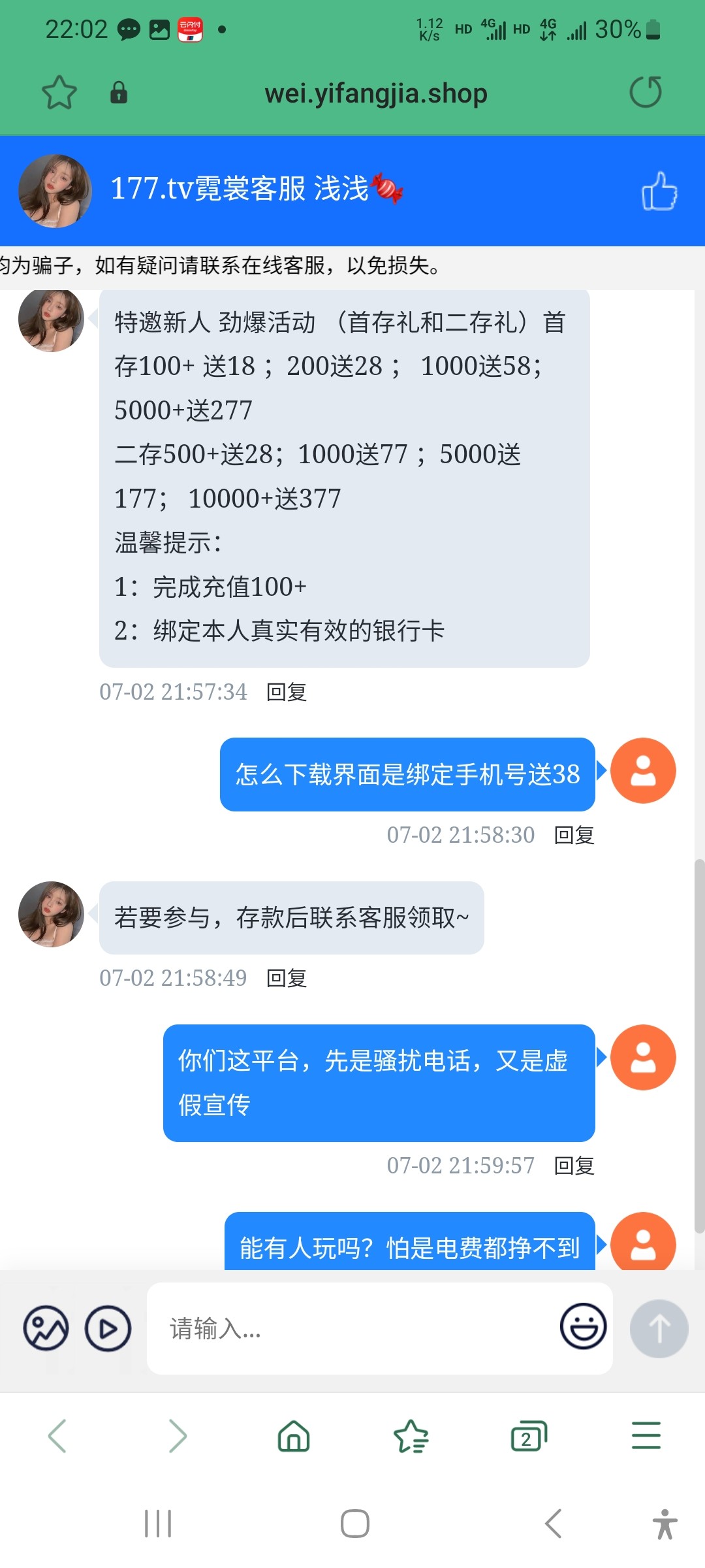 一直有这样电话,内容是注册即送888元。有是甚至是凌晨打过来。下载了又一毛不送。。在这样台子存款玩的真是脑子有毛病。